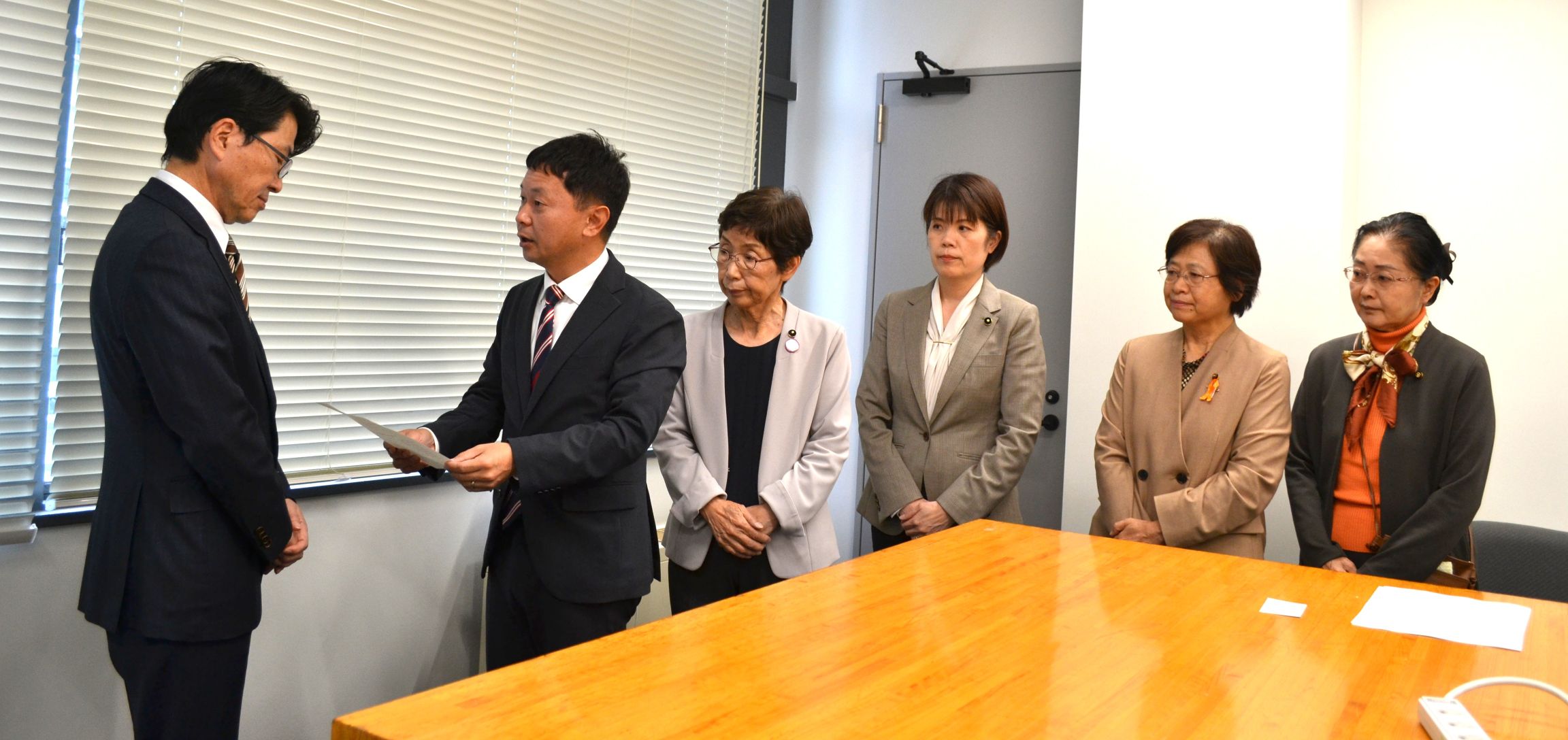 カキ生産量全国1位の広島県内の養殖カキが大量死している問題で、日本共産党広島県委員会副委員長の大平よしのぶ衆院中国比例候補と藤井敏子、河村晃子の両県議は2日、横田美香知事宛ての「カキ養殖業者や関連事業者への支援を求める要望書」を提出しました。中原洋美広島市議団長、谷晴美東広島市議が同席しました。
